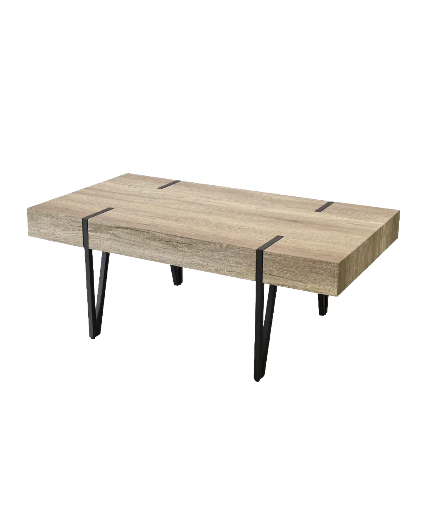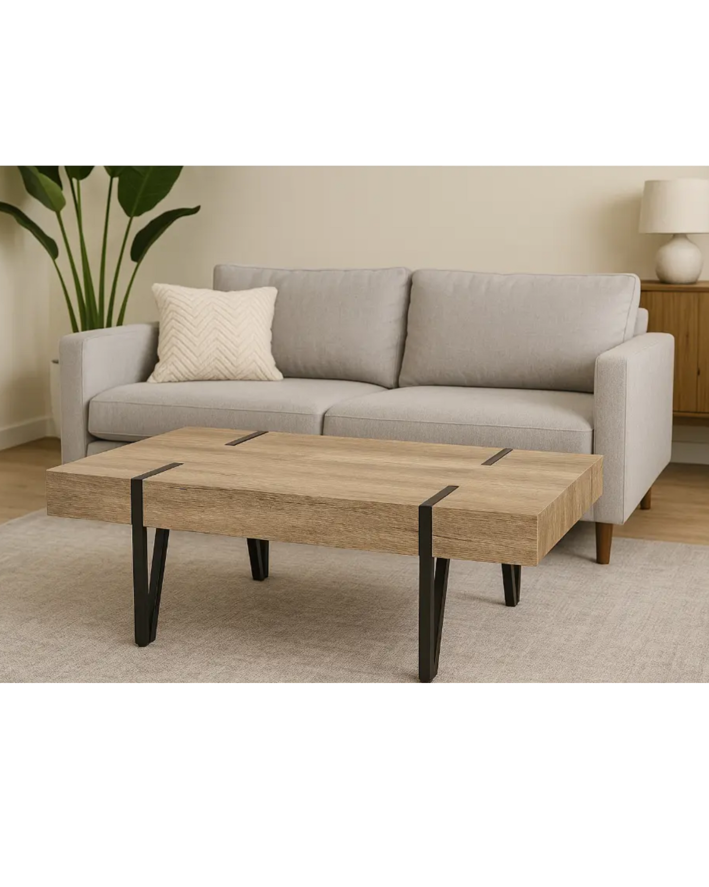 Exquisitely crafted, the Canyon wood effect coffee table marries rustic charm with architectural sophistication. Its rectangular silhouette showcases the rich, textural wood effect surface, elegantly supported by a refined matte-black metal frame. This thoughtful juxtaposition of organic warmth and industrial precision creates a statement piece that enhances your curated interior with understated luxury and enduring stability.